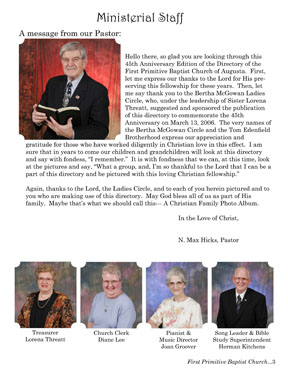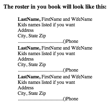 - Roster - list of church membership containing names, addresses, and phone numbers.
